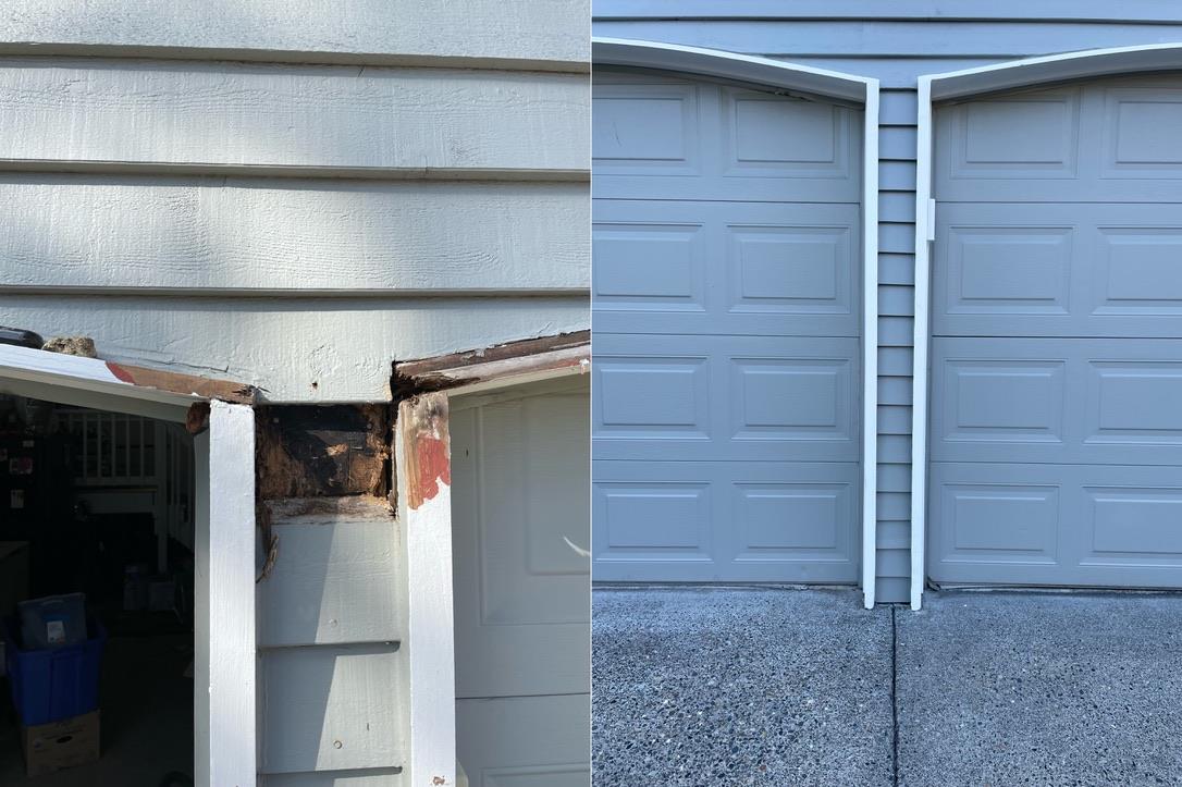 The repaired garage door siding and trim now look as good as new. The combination of new